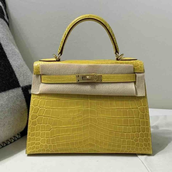 • Hermès Kelly 25 Alligator Shiny Amber Yellow with Palladium Hardware (In Stock)
