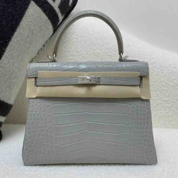 • Hermès Kelly 25 Alligator Matte Gris Perle (80 Pearl Grey) with Lemon Yellow Interior, Palladium Hardware